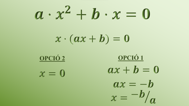 Per resoldre aquesta equació és necessari extreure factor comú (teniu un vídeo que explica com es fa el factor comú al final de les imatges), deixant la incògnita sols fora del parèntesi. Un cop fet això, hem de tenir clar que un dels dos termes ha de donar zero. Una opció és la “x”. L'altre, és la suma/resta que hi ha dins del parèntesi. Llavors igualem aquesta petita operació a zero i aïllem la “x” per trobar el seu valor.