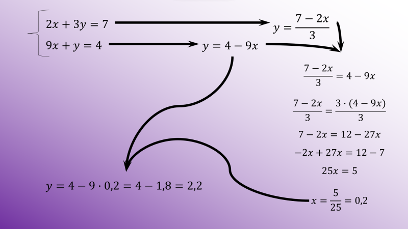 Primer hem d'aïllar la mateixa incògnita a cada una de les equacions. Un cop aïllada, igualem les dues expressions matemàtiques (tal com es veu a la imatge). D'aquesta manera ens queda una sola equació amb una única incògnita. La resolem i agafem el valor que ens ha donat inserir-lo a qualsevol de les dues equacions, en substitució de la incògnita equivalent. Resolem l'operació i ja tenim els dos resultats.